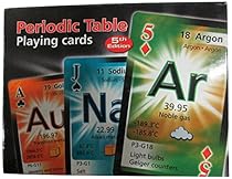 Periodic Table Playing Cards (English, Spanish and French Edition) Description - A double deck of regular playing cards with the Periodic TableElements. Each card features one element, it has the atomic number, name ofthe element in English, French and Spanish, the mass, the category, meltingand boiling points, period and group, natural state and common usages. Agreat learning aid.